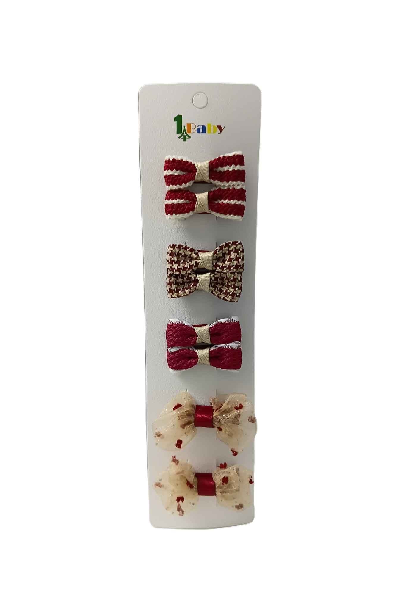 - Mixed fabrics and textures add variety (knit-look stripes, woven pattern bow, textured red bows, sheer printed bows)