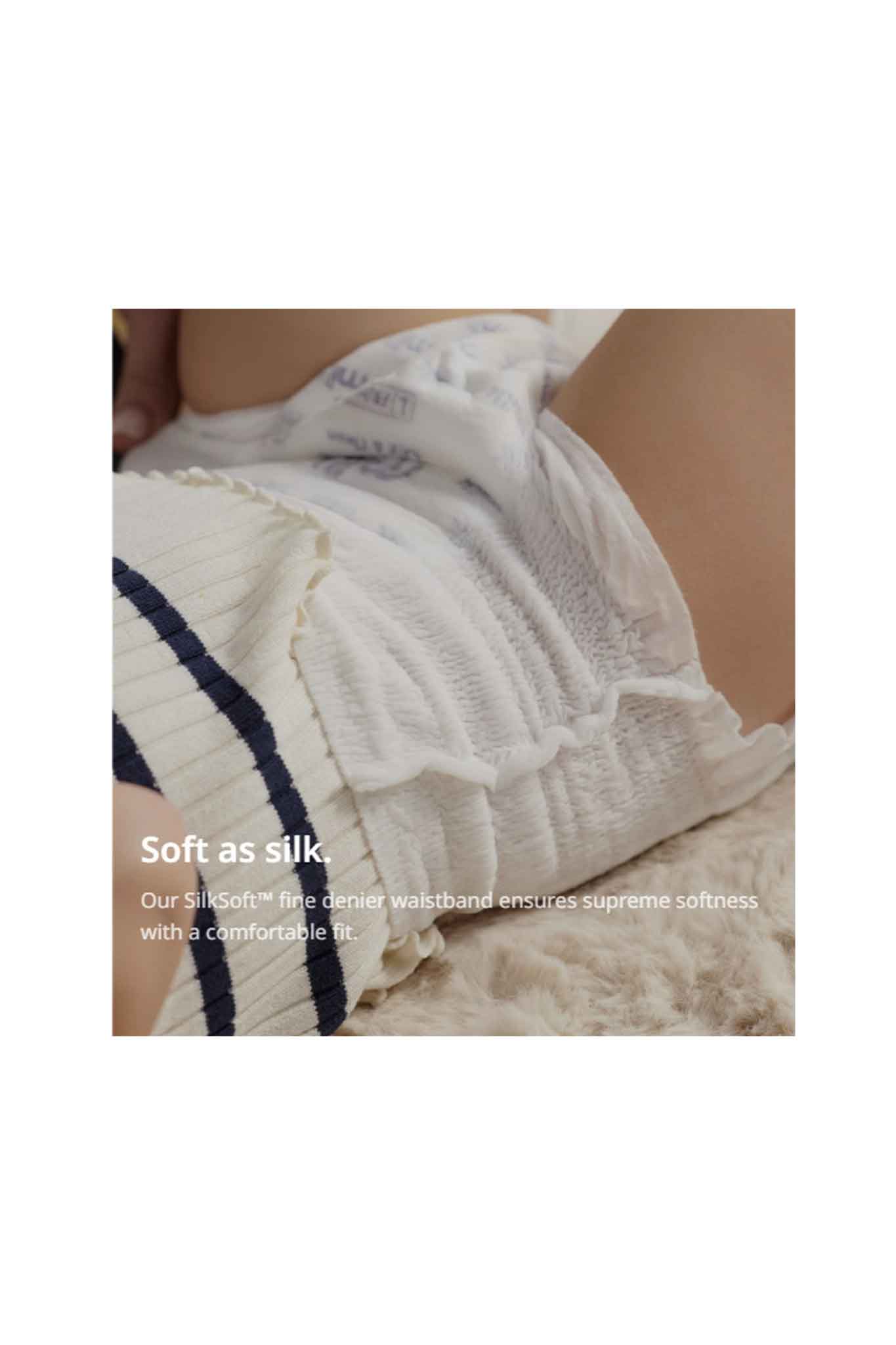 - Exceptional Comfort: The first-of-its-kind SilkSoft fine denier waistband offers a soft, stretchy fit thats gentle on your babys skin.