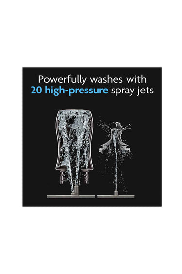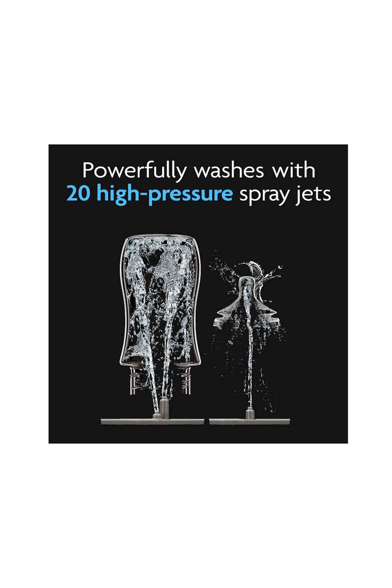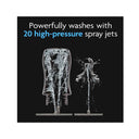 - Powerfully washes with 20 high-pressure spray jets