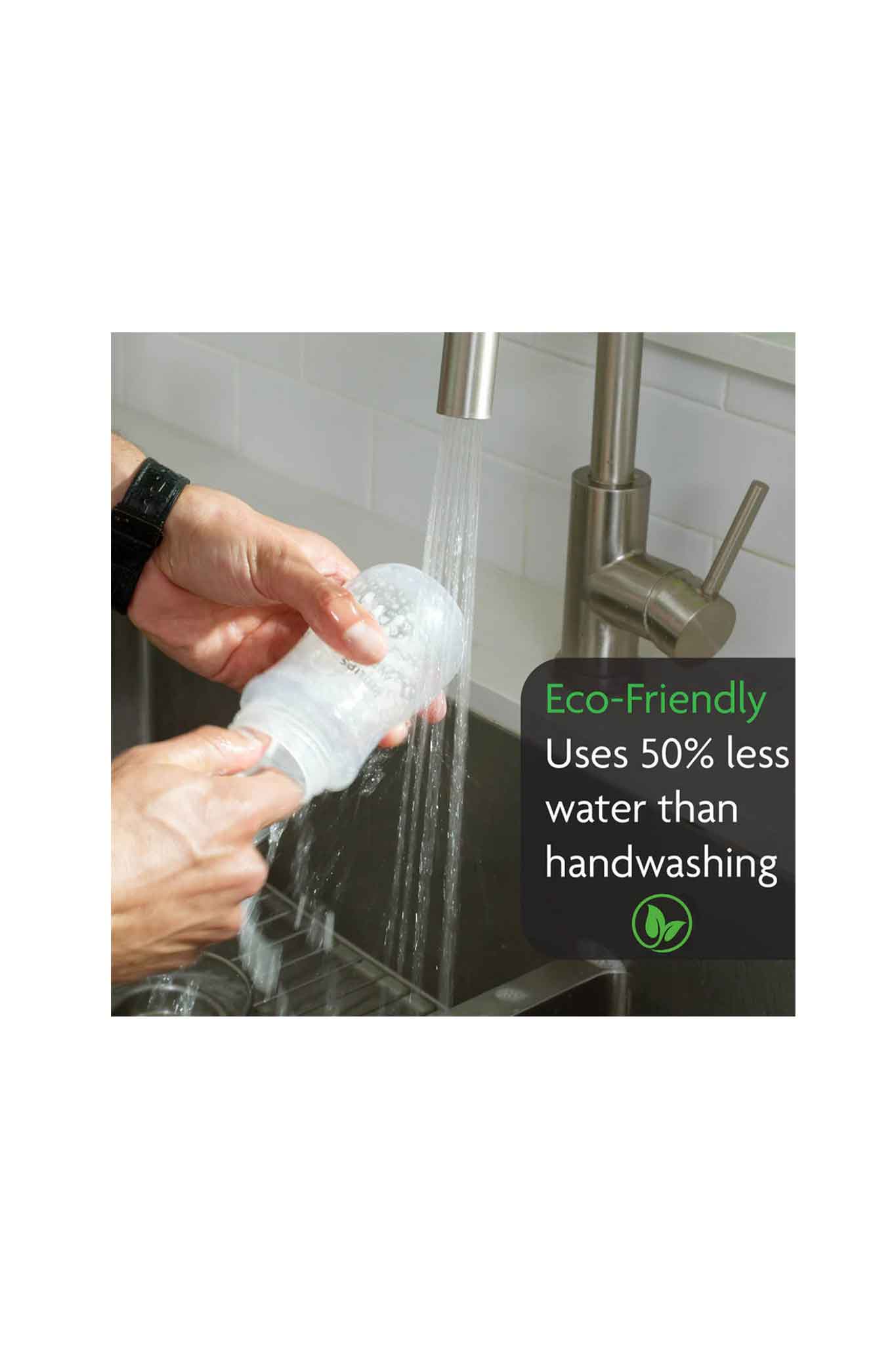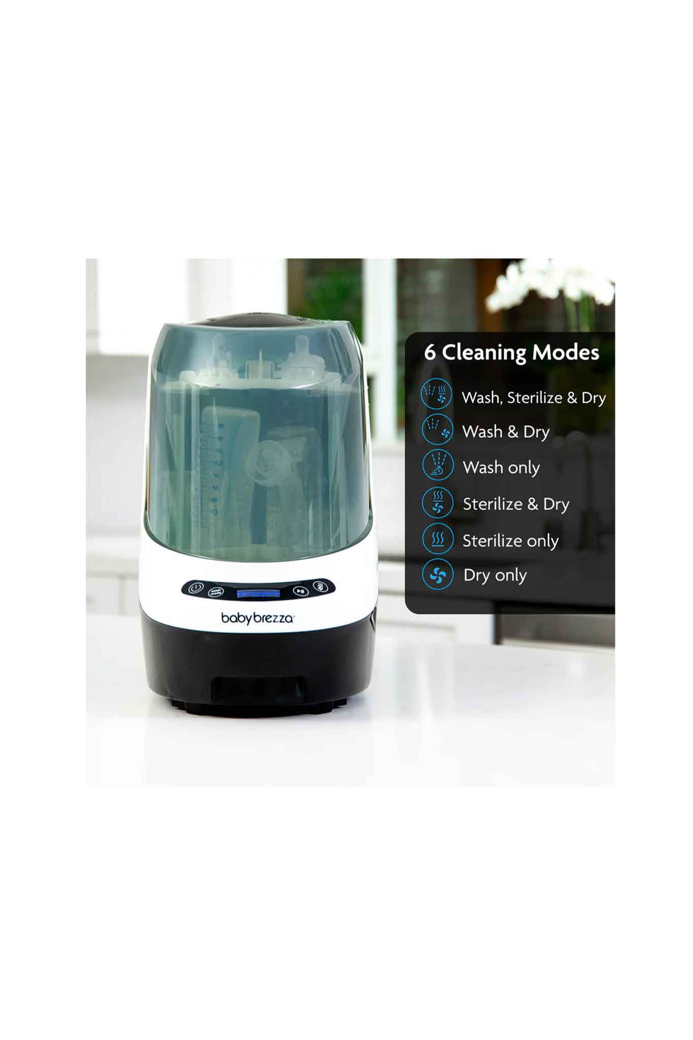 - 6 Cleaning modes: Wash-Sterilize-Dry; Wash-Dry; Wash Only; Sterilize-Dry; Sterilize Only; Dry Only No plumbing required with removable clean & dirty water tanks Only works with baby-safe, Baby Brezza Detergent Tablets. Free 60 ct tablet pack included. Eco-Friendly: Uses 50% less water than hand washing