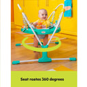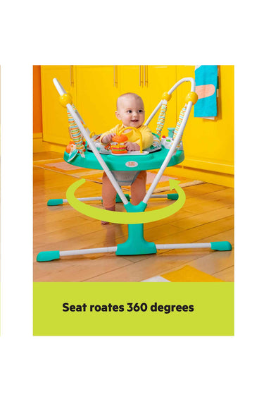 The seat rotates 360° for easy access to all the activities while baby jumps and plays. In case of any messes or for regular cleanings, simply remove the seat pad and toss in the laundry!