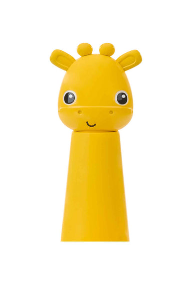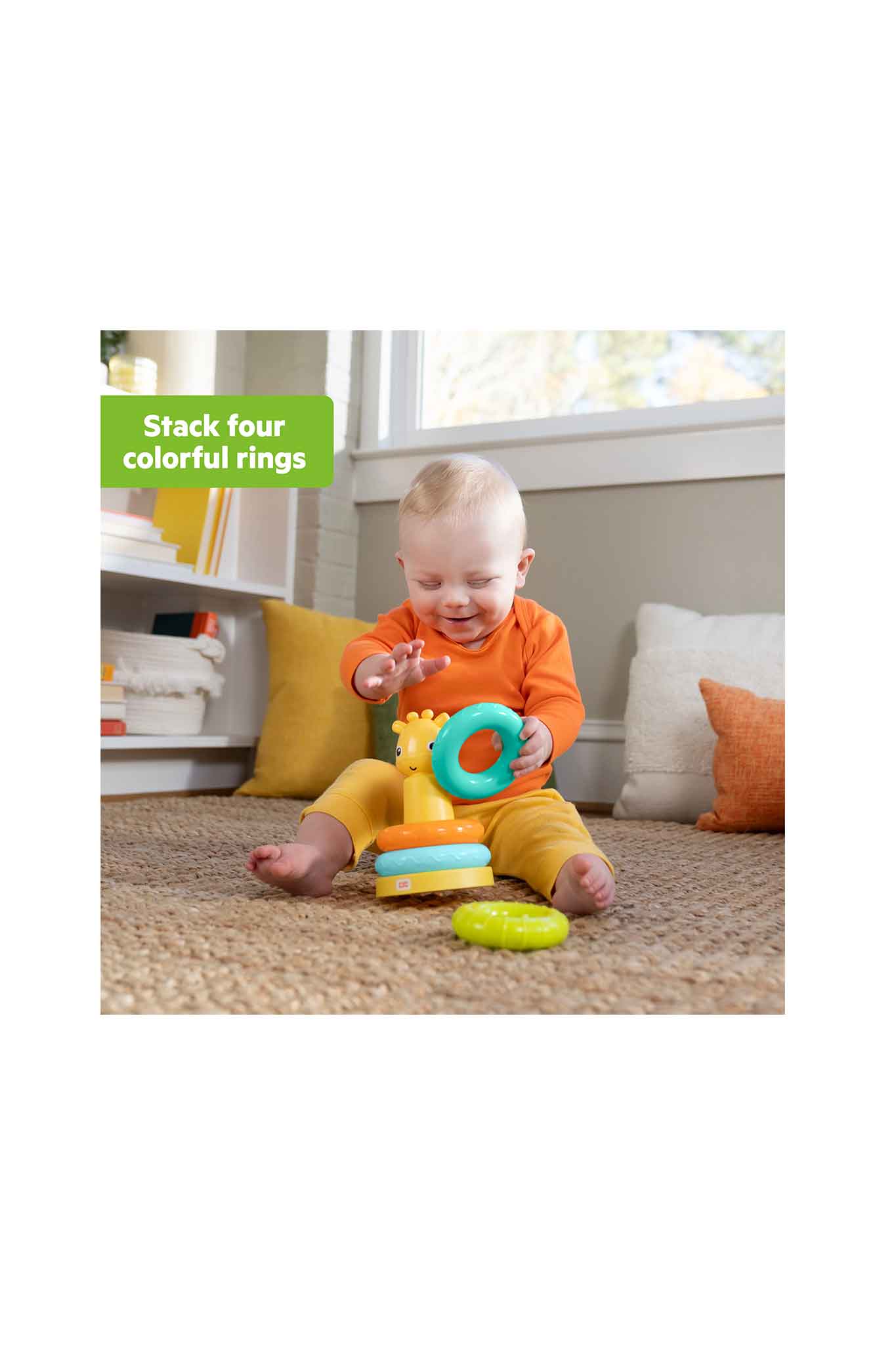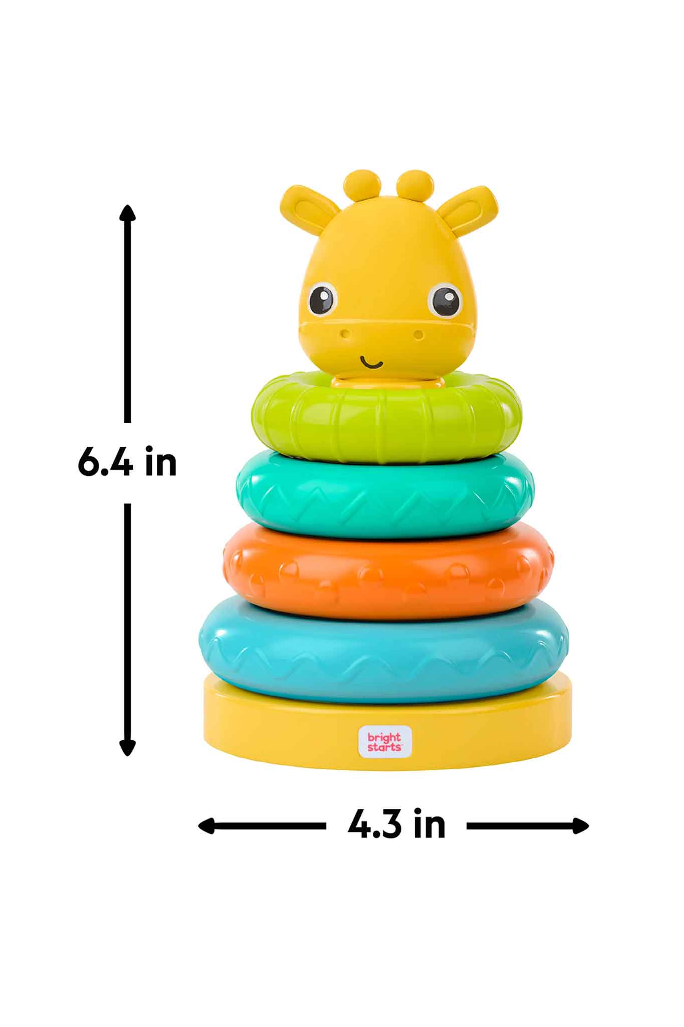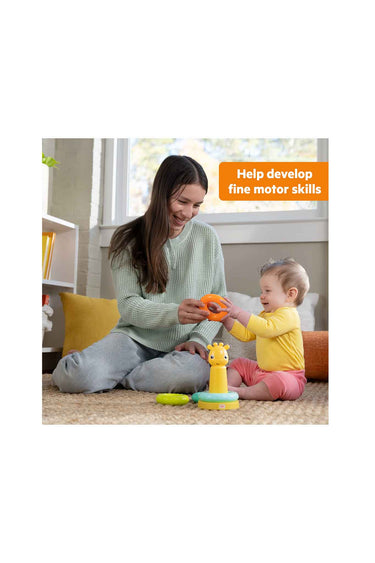 - Helps build fine motor skills as baby stacks 4 rings toward the giraffe’s friendly face
