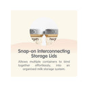 Coloured lids for easy identification Different coloured lids (Sold separately) are available for you to clearly differentiate when your milk was expressed. Milk expressed in the day has more foremilk (water) to keep baby hydrated in the heat, while night-time milk is richer with hindmilk to keep baby fuller for longer. Connect them with the snap on buttons and you have an organized milk storage system where you can easily identify which bottle of milk to use first based on the first-in-first-out principle. |