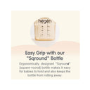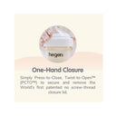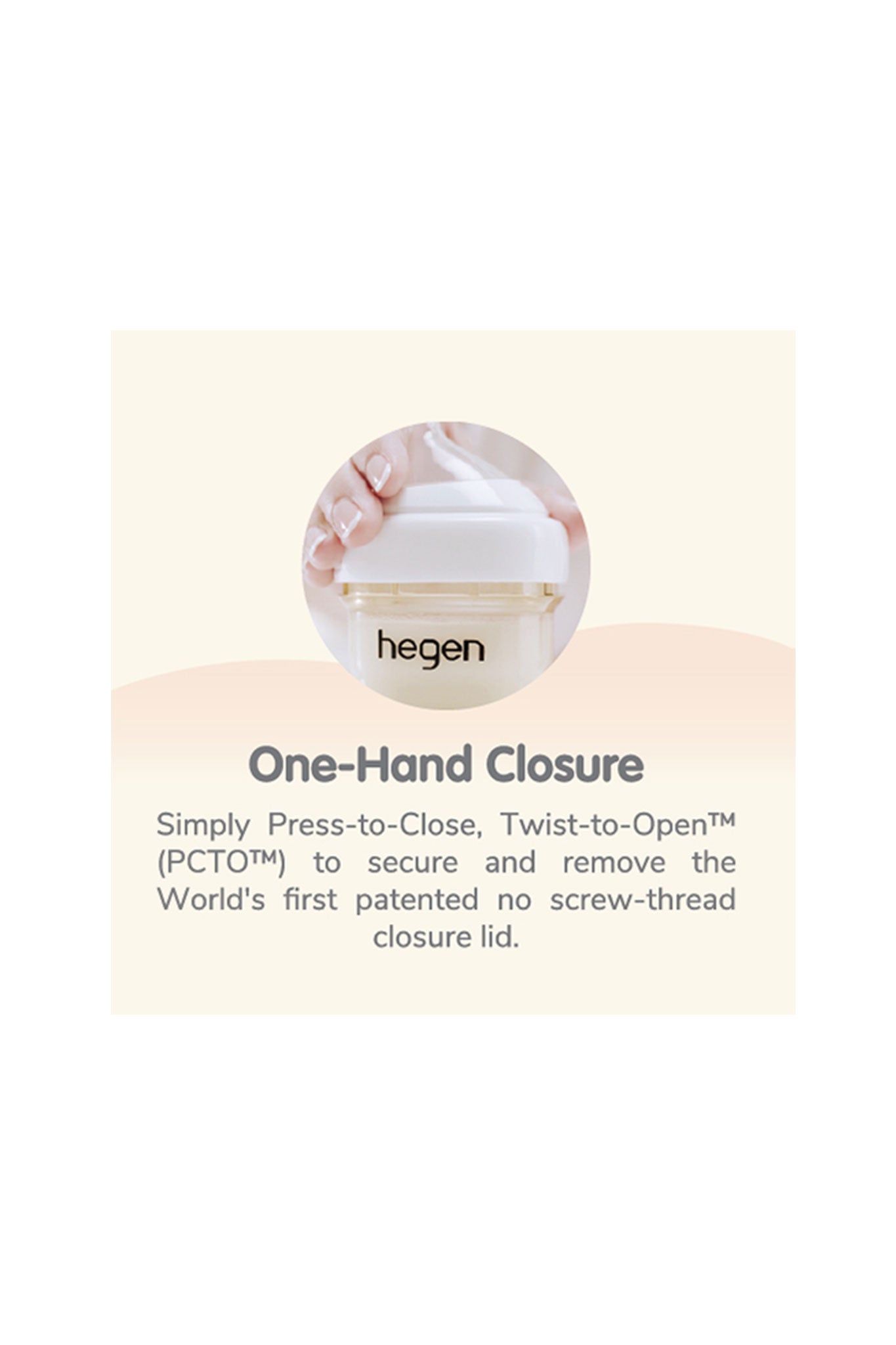 World's first patented no screw thread closure; the Hegen Press-to-Close, Twist-to-Open™, PCTO™ innovation allows the bottle to be pressed on and twisted off conveniently with zero spillage.