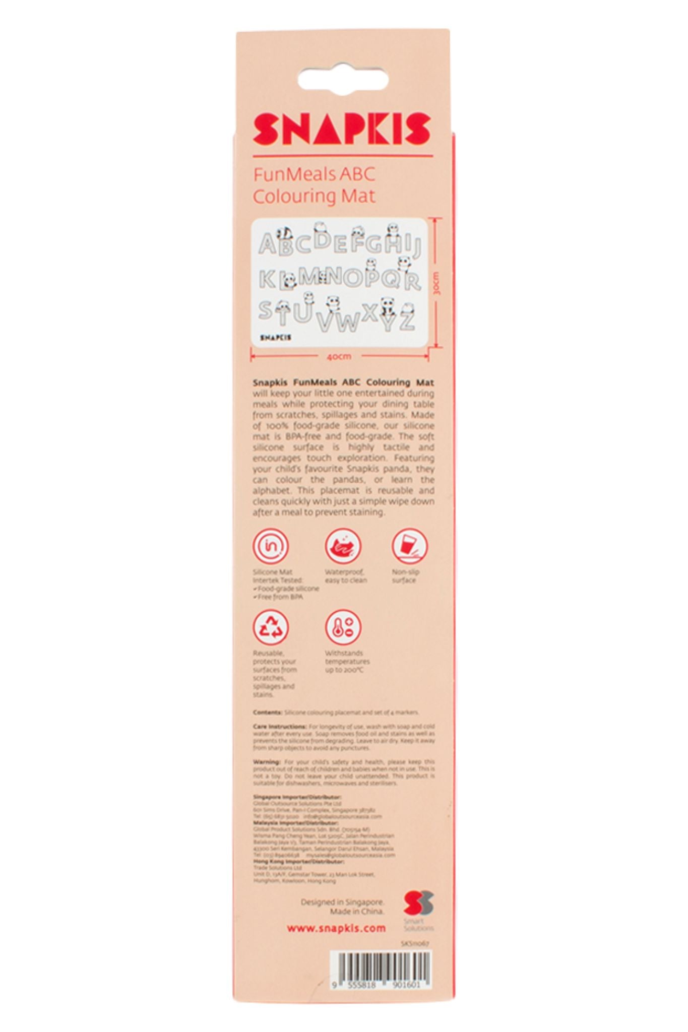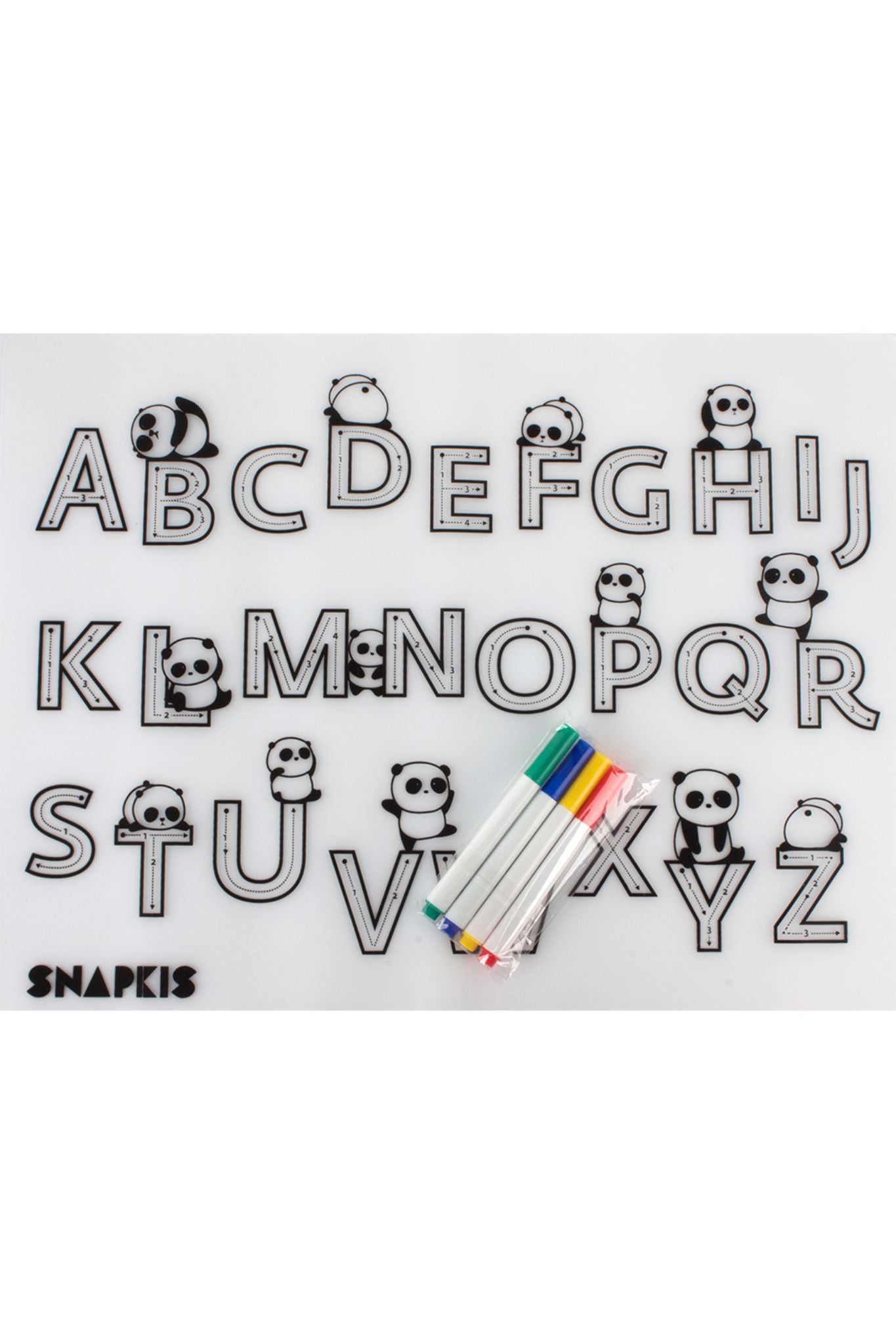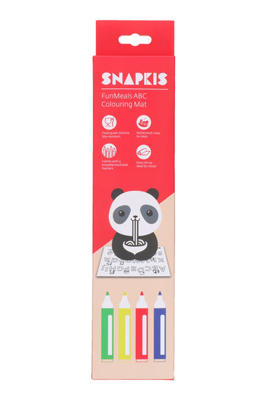 • Featuring your child’s favourite Snapkis panda, they can colour the pandas, or learn the alphabet. This placemat is reusable and cleans quickly with just a simple wipe down after a meal to prevent staining.