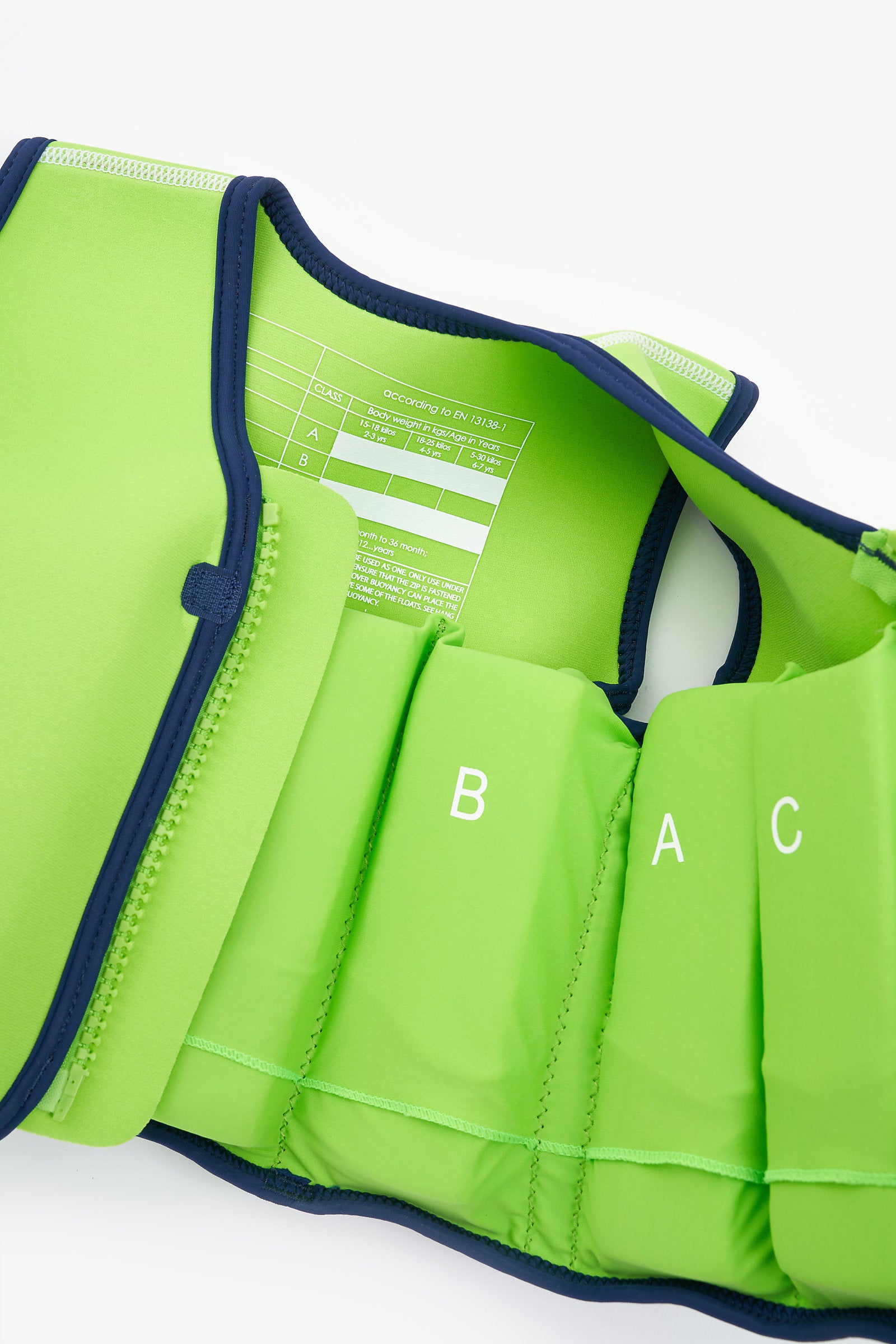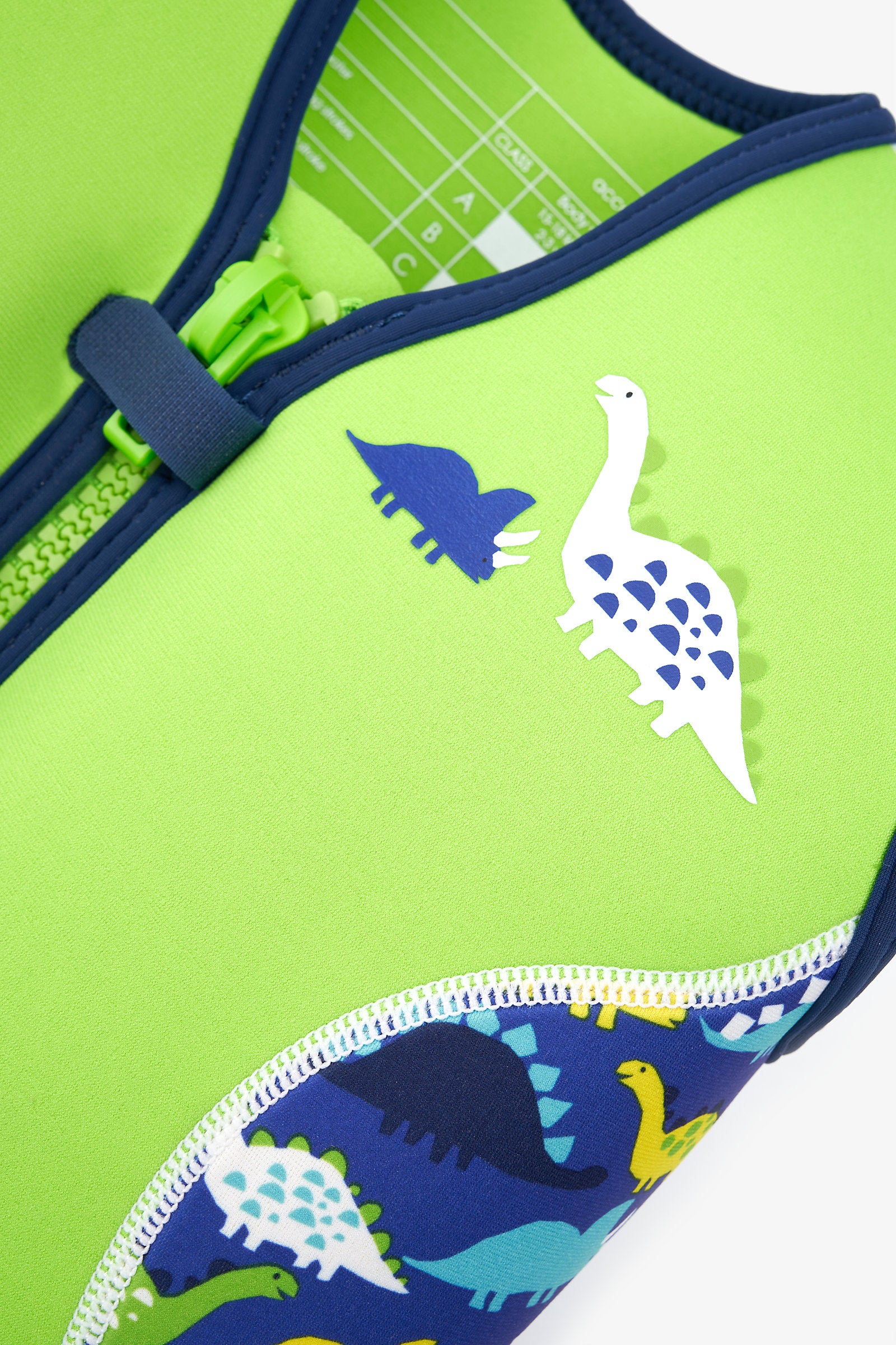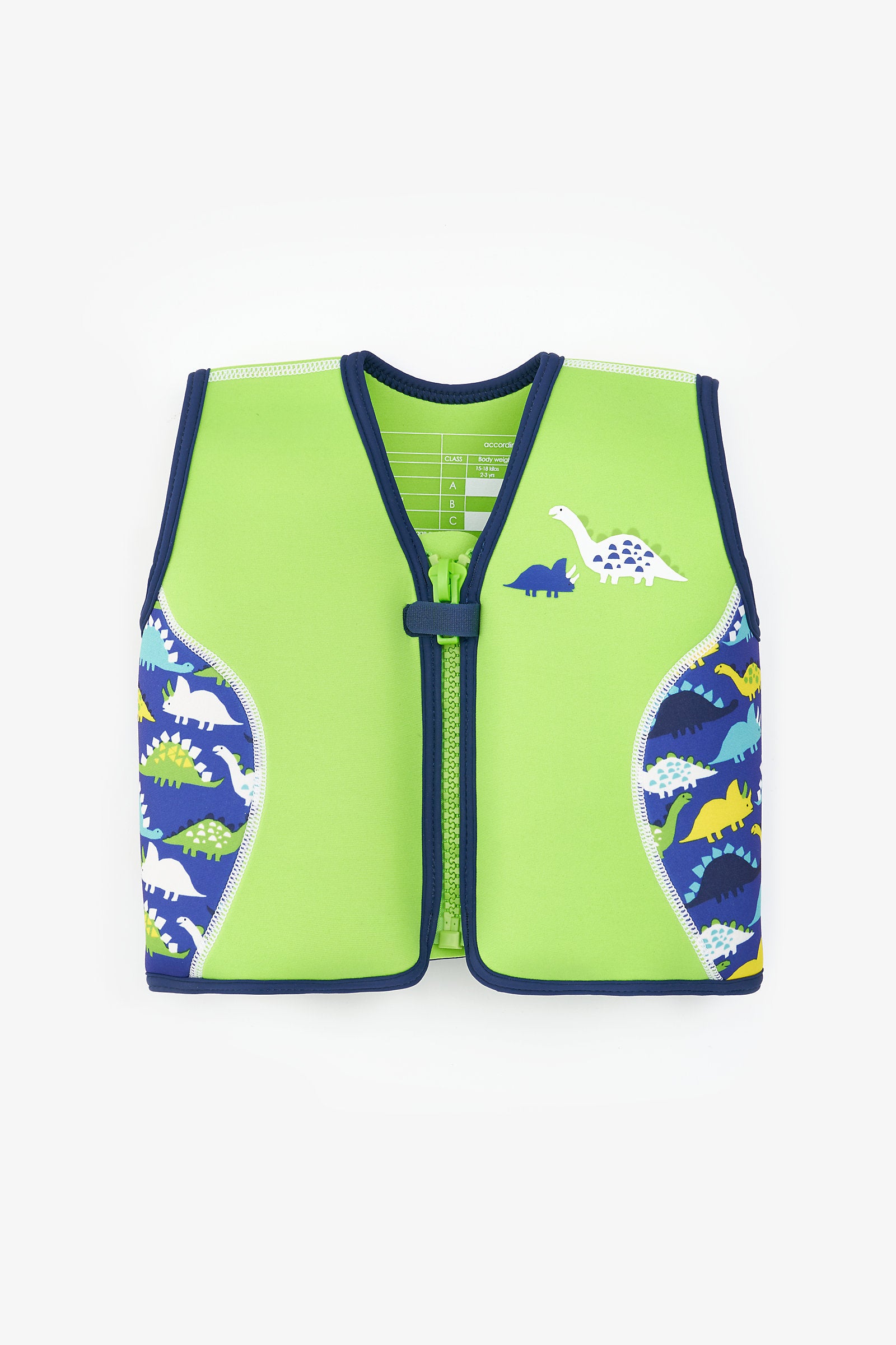 This dino swim jacket is a great way to help your child perfect their swimming strokes and gain the necessary confidence to move towards independent swimming.The jacket has multiple floats inside special pockets. Begin using the jacket with all the floats in place, then as your child begins to gain confidence, the floats can be gradually removed, reducing buoyancy until they are no longer required.Designed for a snug and comfy fit, this neoprene swim jacket has soft binding to minimise the possibility of rubbing and chafing. Fastened with a chunky zip with a touch-close tab to maximise security and with an internal zip guard to prevent it rubbing on the skin. This swim jacket provides 100% UV protection when worn outdoors.