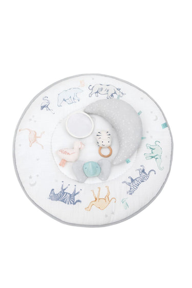 - Includes 3 interactive toys, a mirror, and oversized tummy time pillow