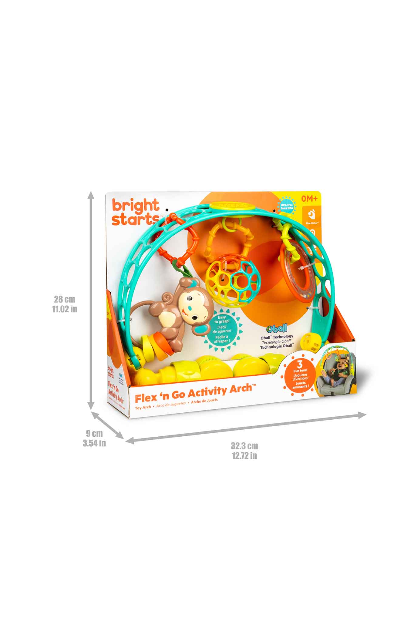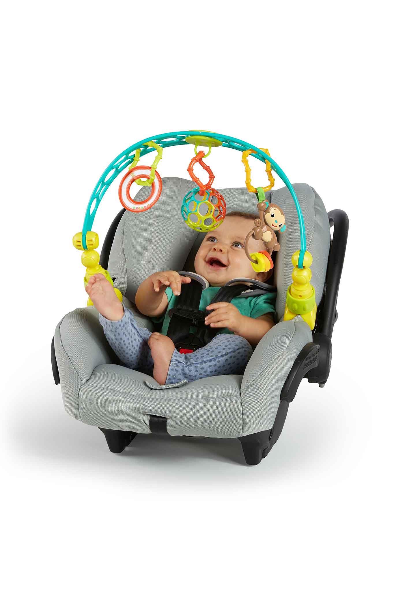 - Flexible arch bends and adjusts to bring toys within baby’s reach