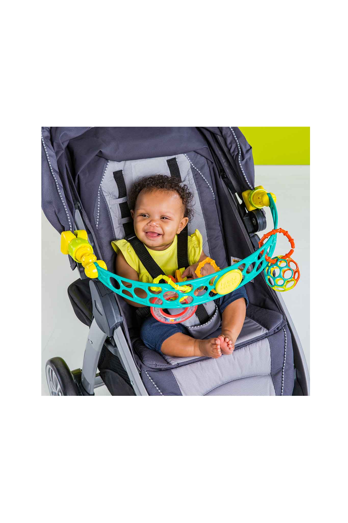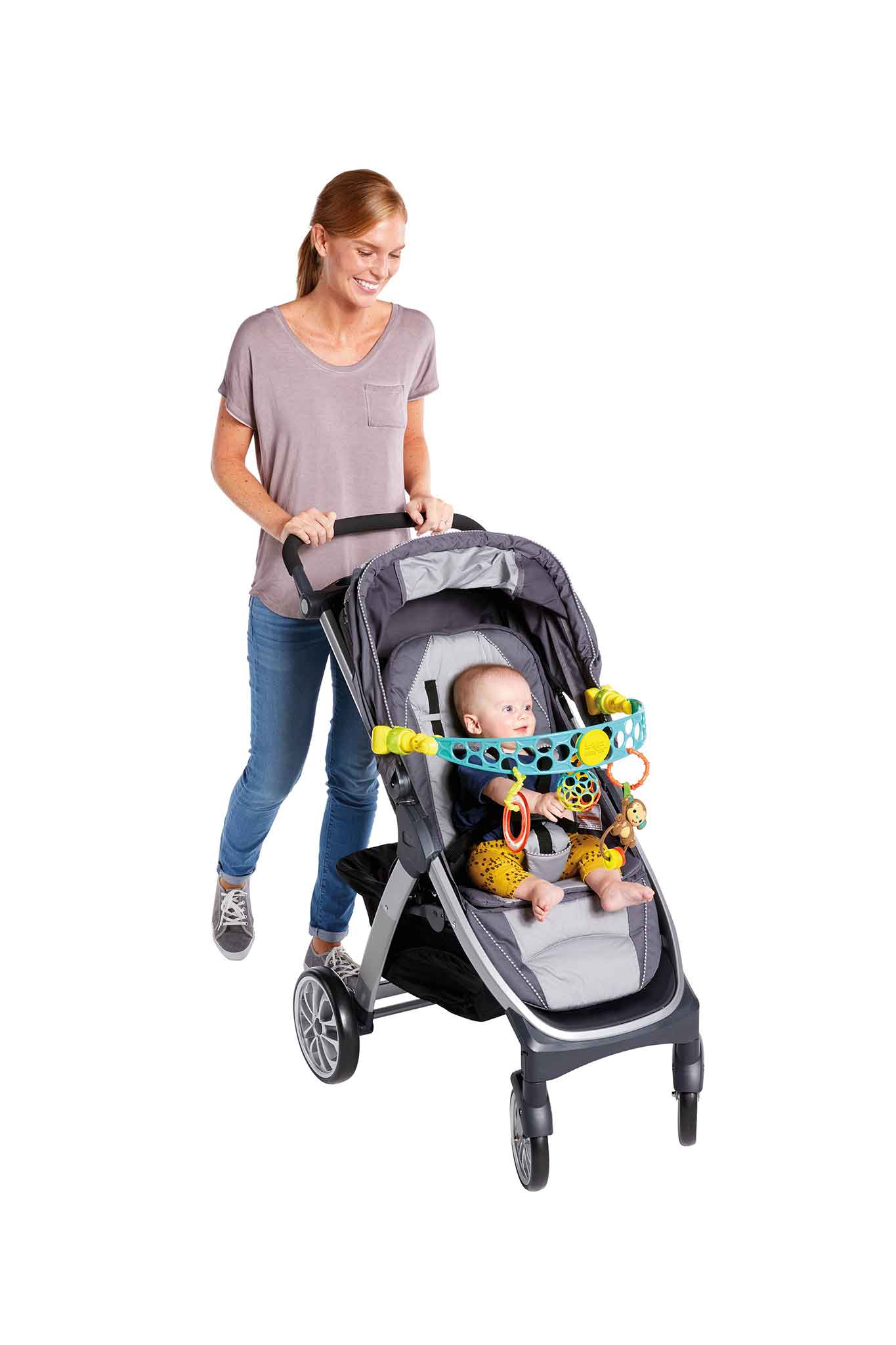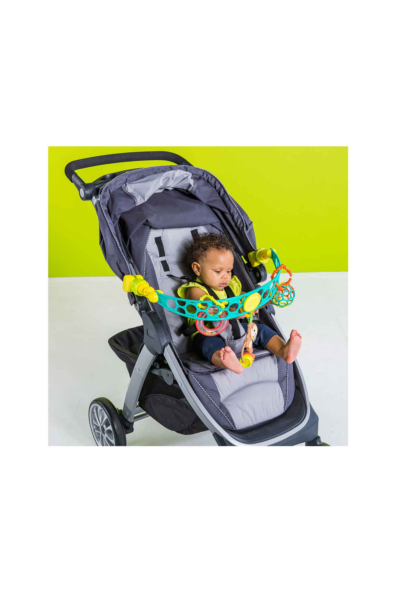 - Assorted hanging toys (e.g., rattle, mirror/crinkle, textured teether)