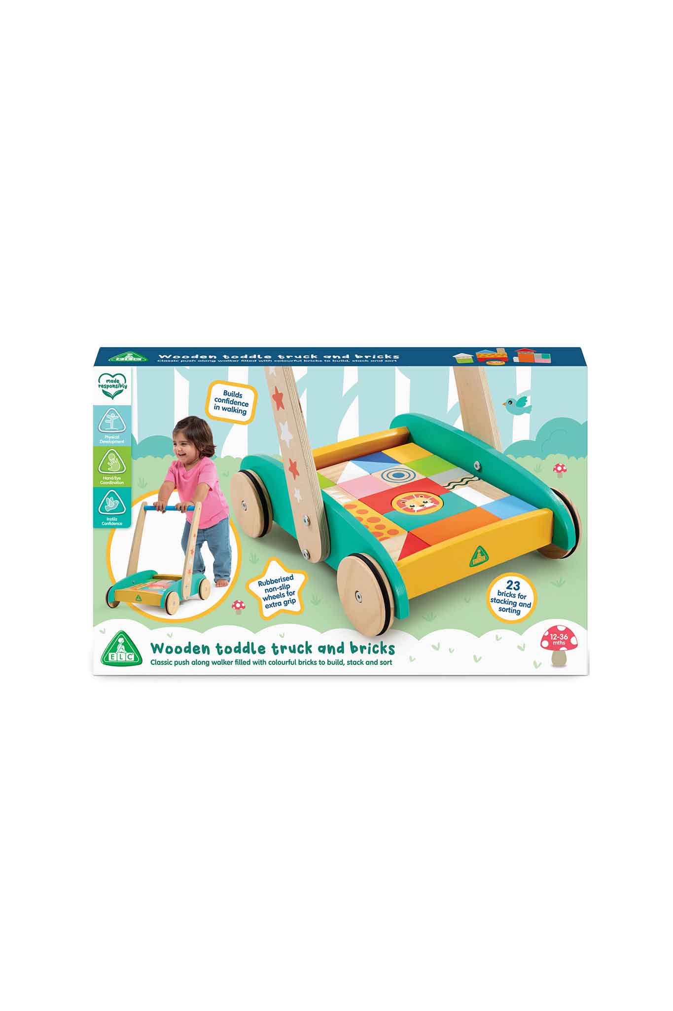 - Sturdy wooden toddle truck helps support balance and confidence for early walkers