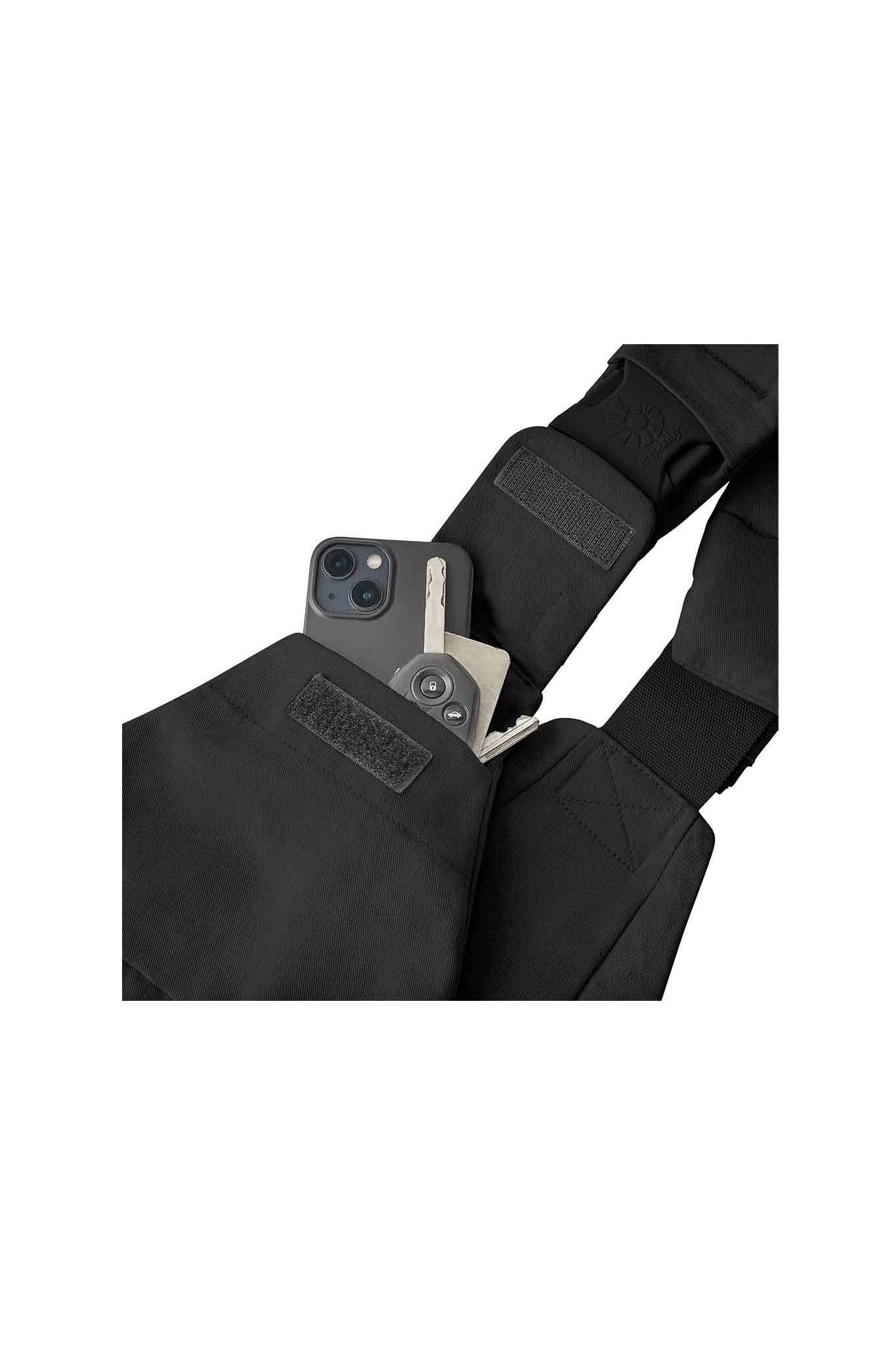 - Front pocket holds phone, keys, and essentials
