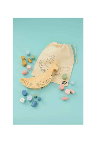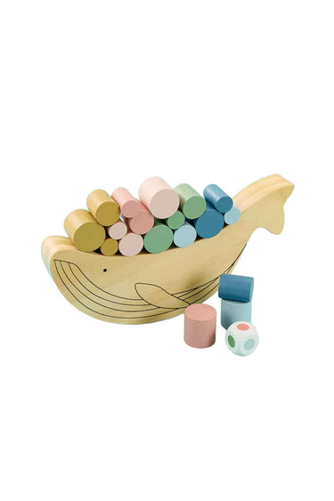 Charming wooden balance game with a rocking whale and colourful blocks—stack, balance, and play together. Great for coordination and early maths (ages 3+).