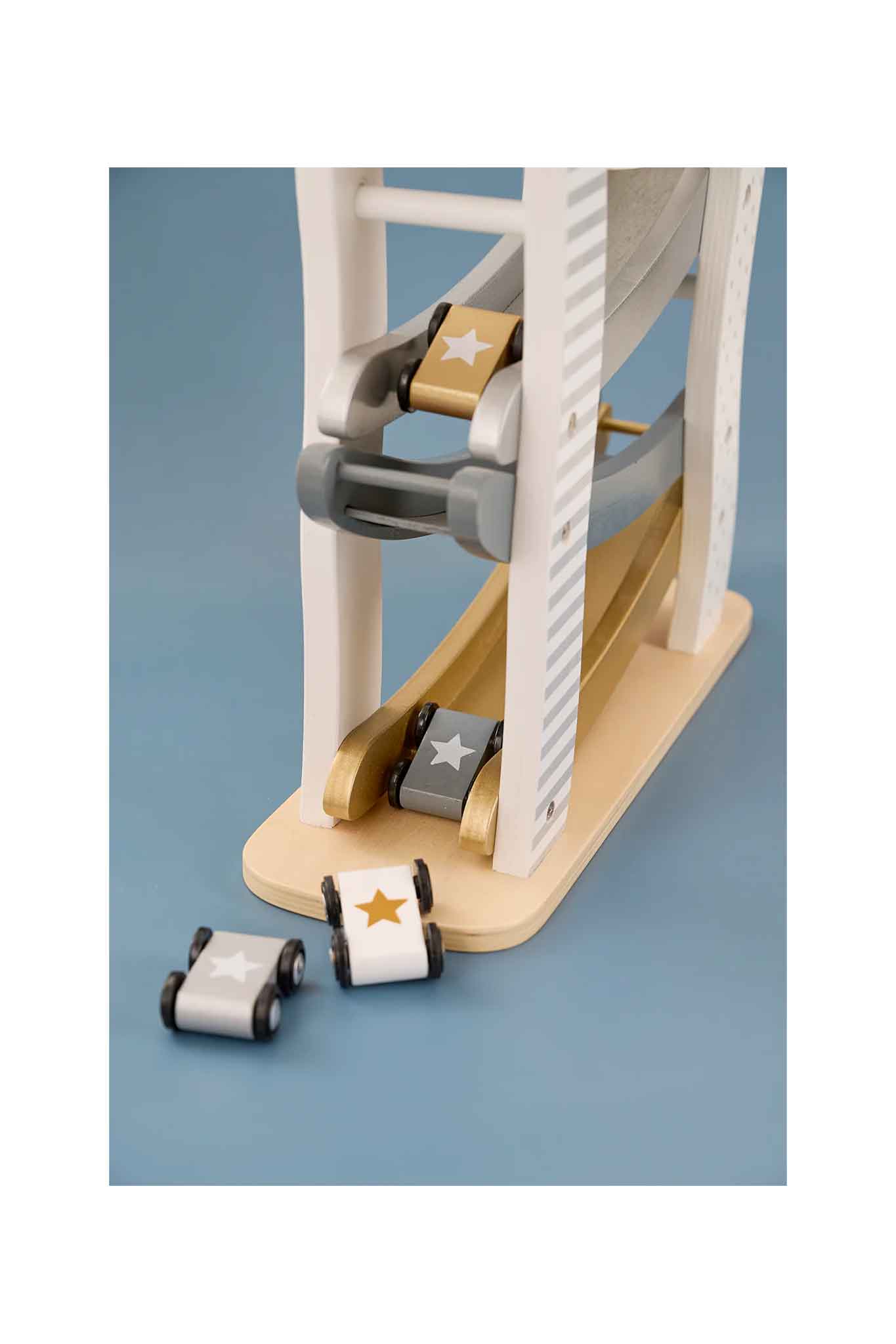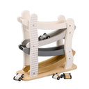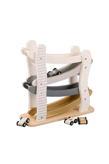 Stylish silver wooden car roller with 4 matching cars. Drop a car at the top and watch it zig-zag down—endless cause-and-effect fun for ages 18 months+.