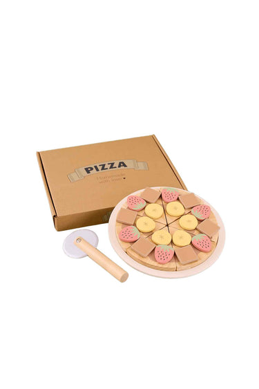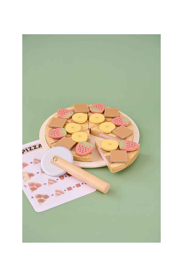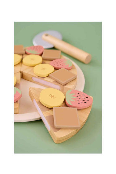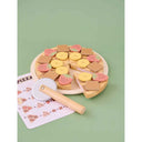 Wooden dessert pizza set with sliceable pieces + toppings and pizza cutter for creative pretend baking, age 2+
