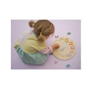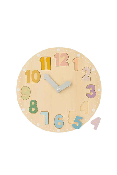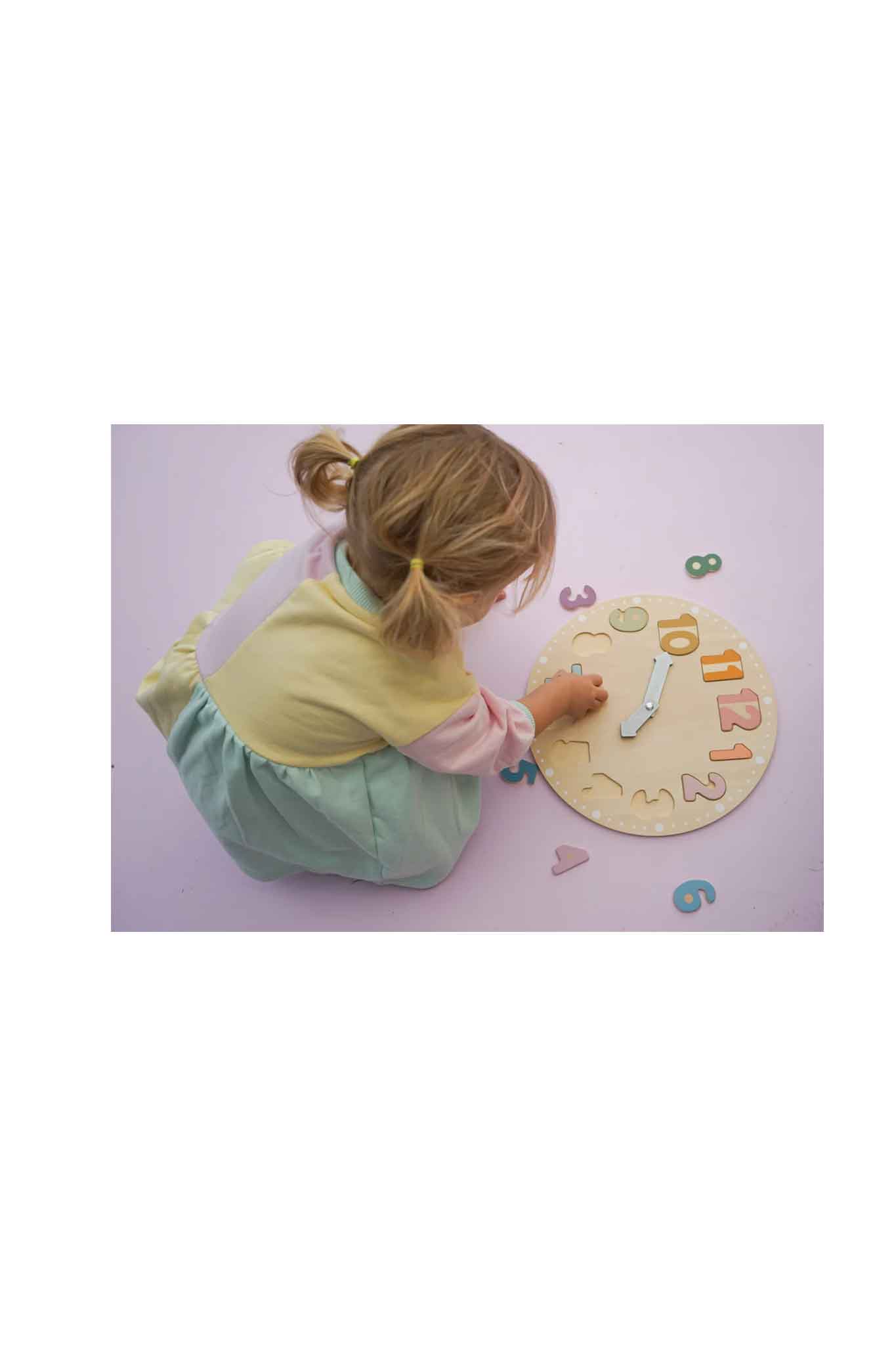 Wooden puzzle clock with movable hands and number pieces, learn to tell time + colours/shapes, ages 3+, 30 × 30 cm