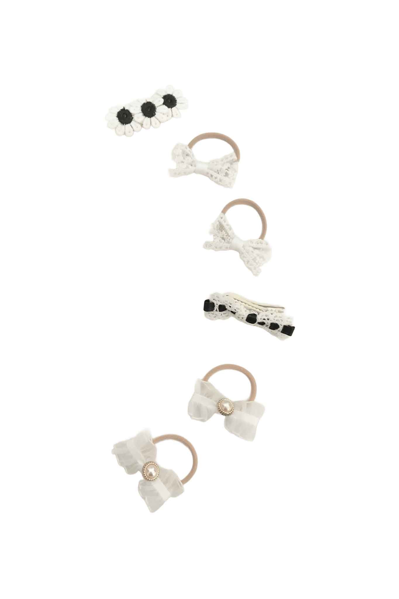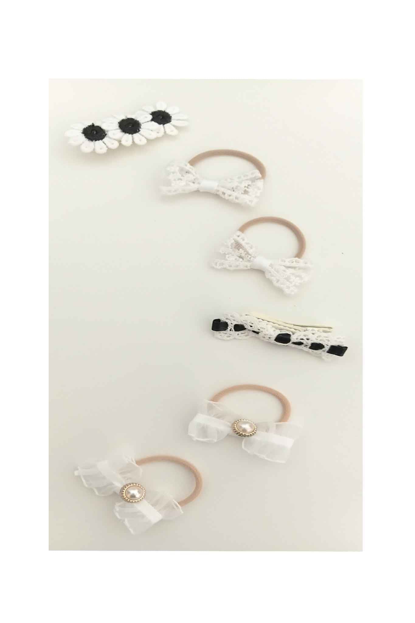 - Hardware : metal clips; elastic hair ties; faux-pearl decorative buttons.
